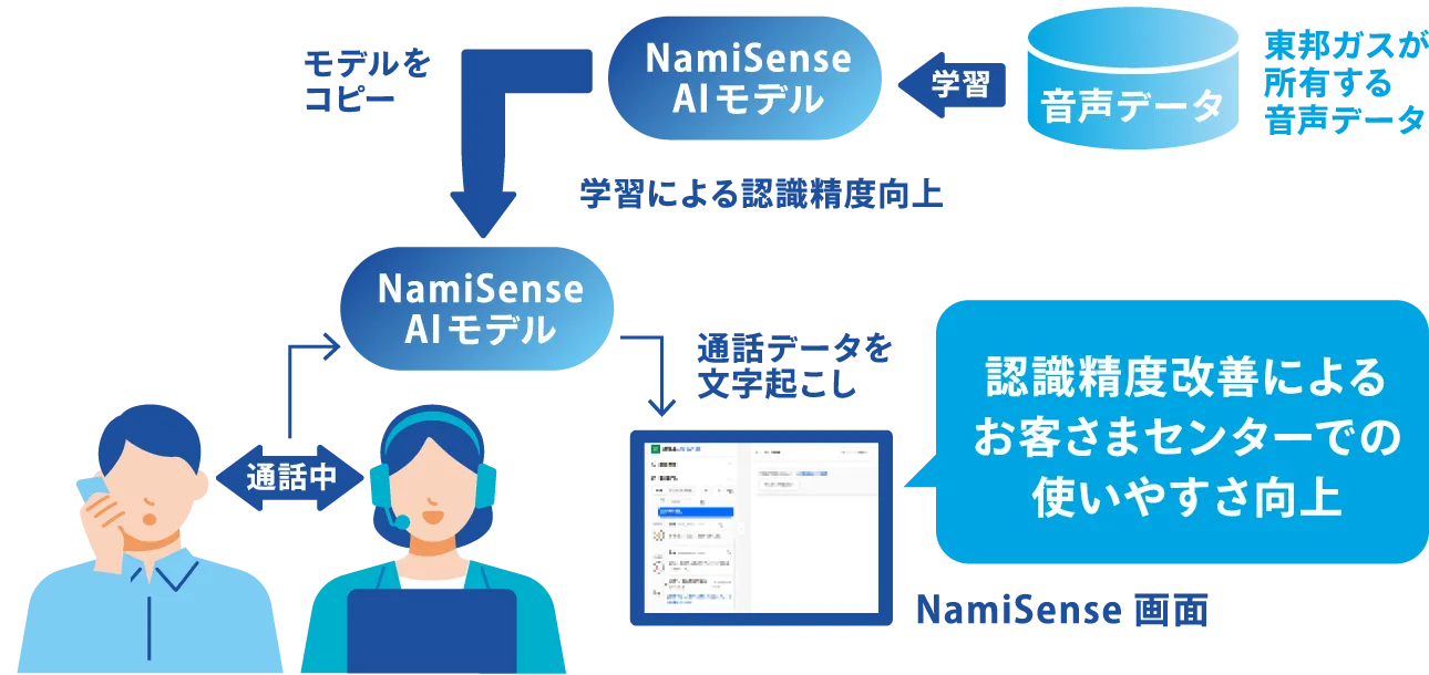 東邦ガス内に蓄積されたお客さまセンターの音声データをAIに学習させて日本語認識精度を向上。