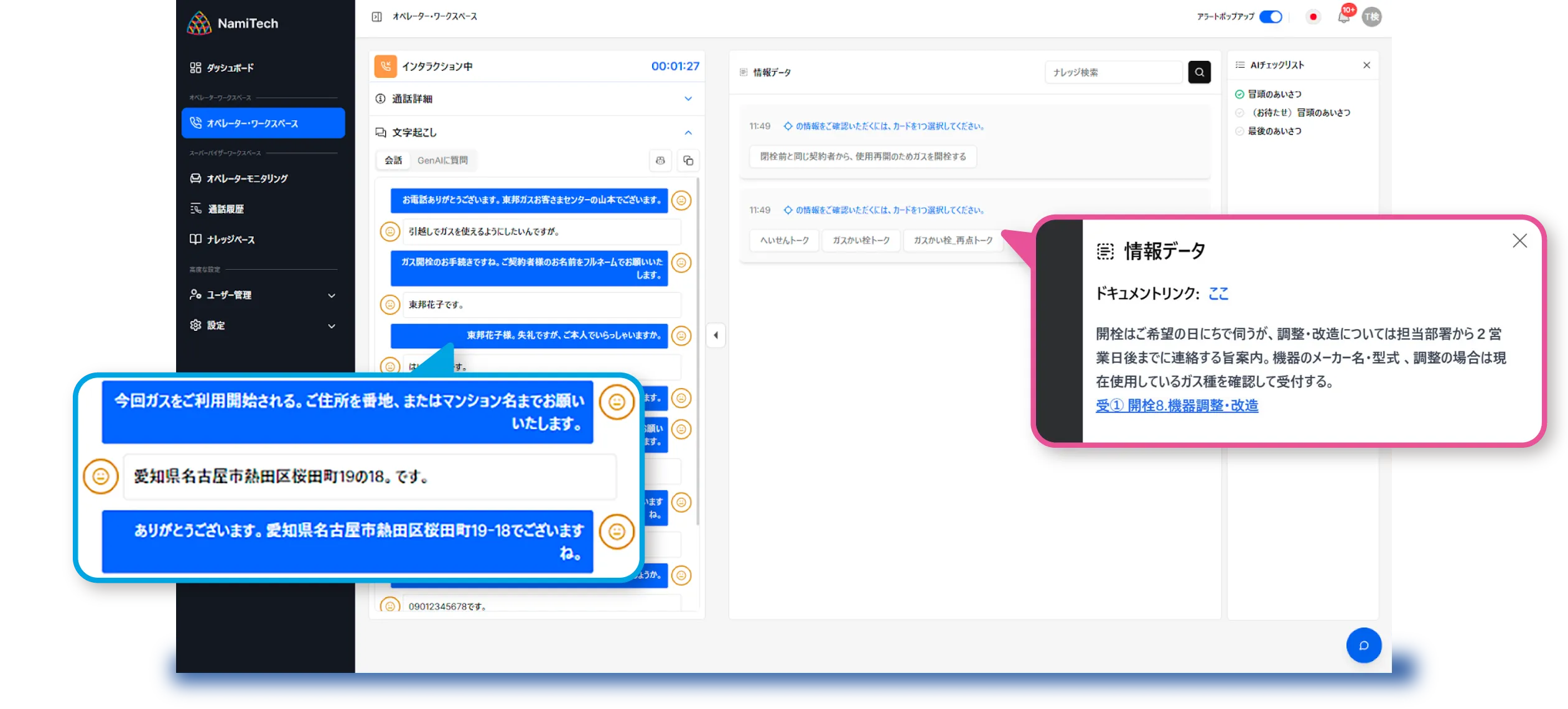 さらに座席表や応対品質評価などNamiSenseの標準機能を活用すれば、